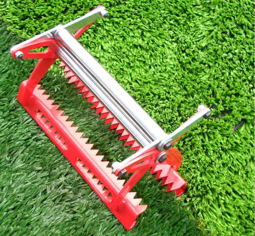 Gripping tongs for a fast and easy alignment of artificial grass strips.